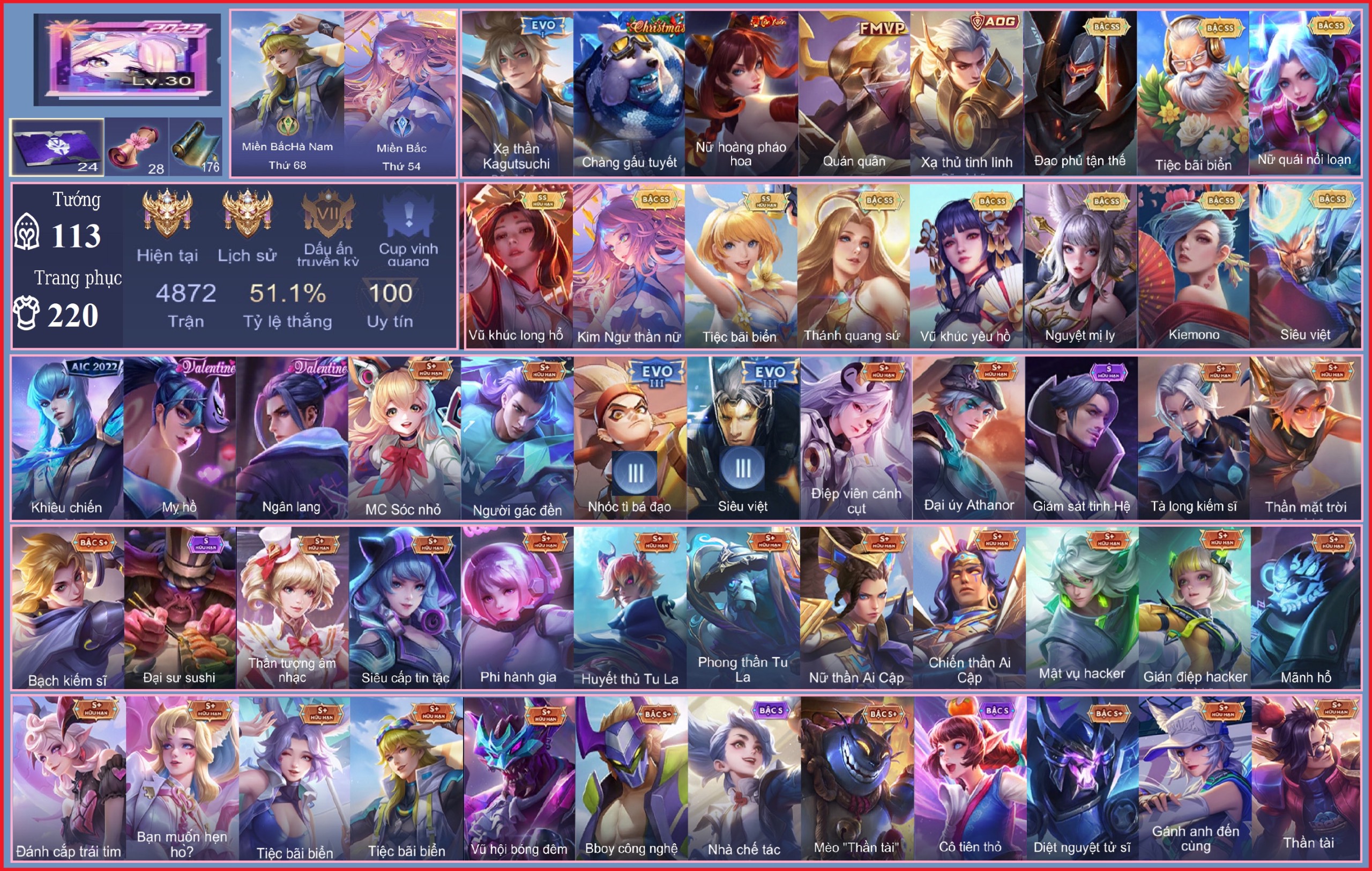 Tài khoản #5580 - Kim Cương V - Tướng 46 - Trang phục 41 - Ngọc 61