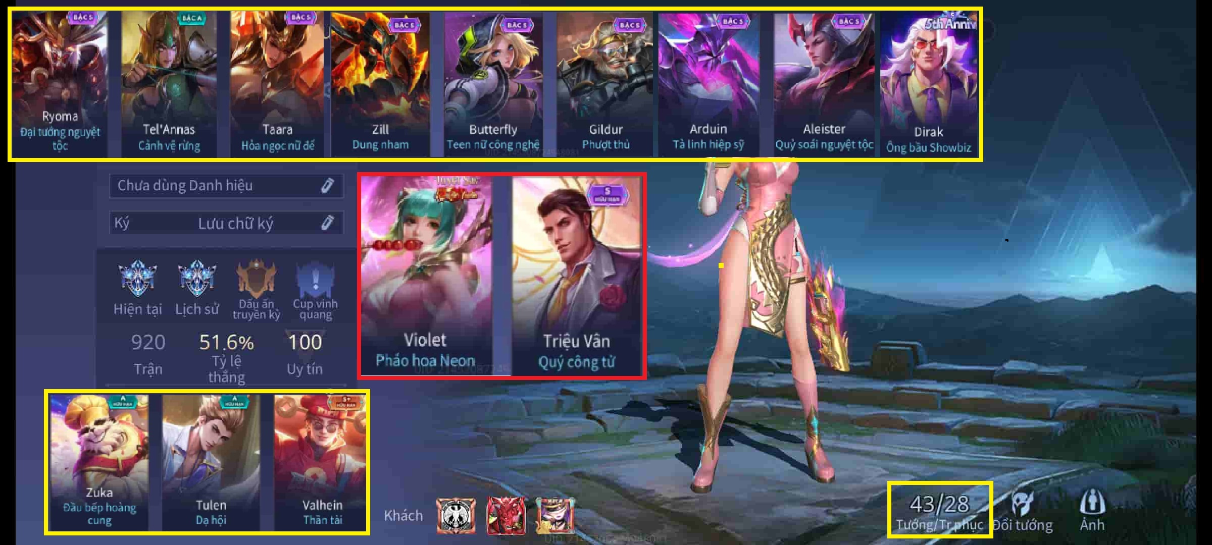Tài khoản #6631 - Kim Cương V - Tướng 70 - Trang phục 63 - Ngọc 90