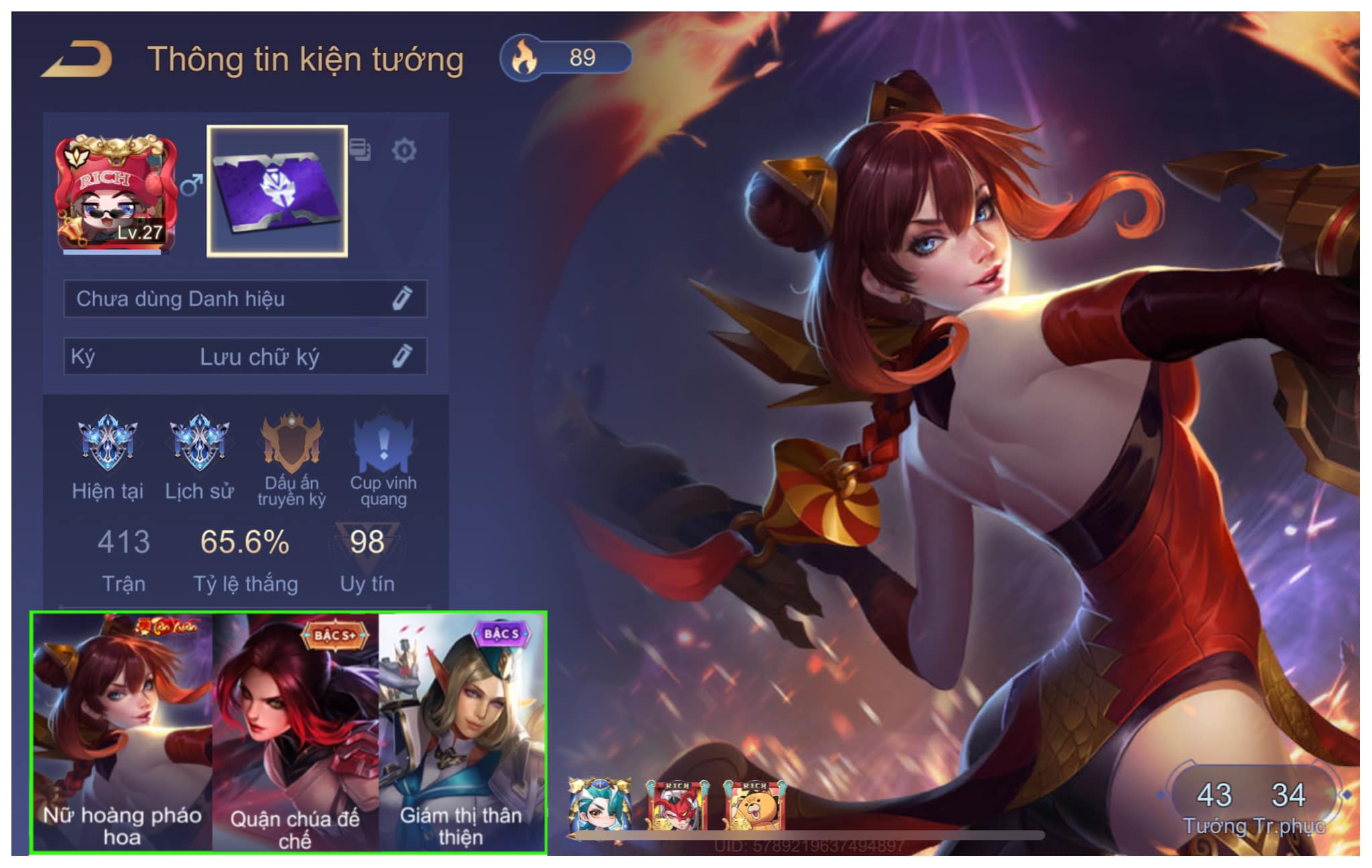 Tài khoản #6635 - Kim Cương IV - Tướng 71 - Trang phục 57 - Ngọc 90
