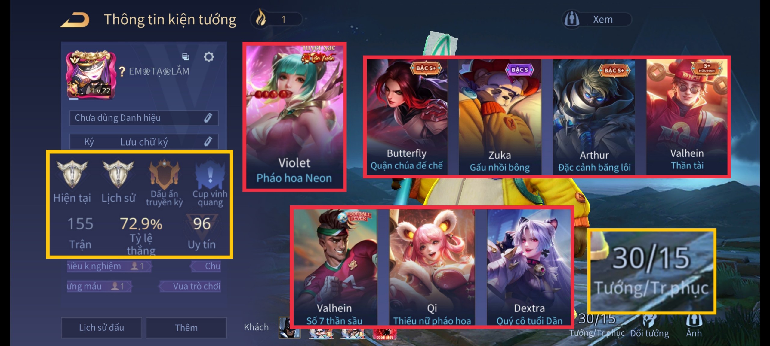 Tài khoản #6663 - Bạch Kim III - Tướng 60 - Trang phục 85 - Ngọc 90